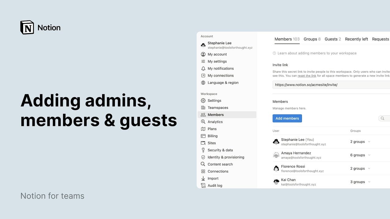 Teamspaces are dedicated spaces for every team within your organization or company. Each teamspace has its own members and permission levels, which can be customized by its teamspace owners. Learn more about adding members and assigning permissions in teamspaces →